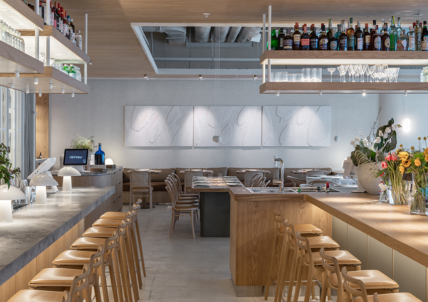 L'intérieur du restaurant est fait dans un style minimaliste de matériaux naturels - bois, cuir, marbre. Les couleurs claires, l'absence presque totale de décor, la simplicité des lignes donnent à l'espace légèreté et aisance. La seule décoration de la salle sont des compositions florales de plantes vivantes. Cette combinaison ajoute à l'intérieur une noblesse particulière, et tous ensemble semble très élégant, créant une atmosphère chaleureuse et agréable.